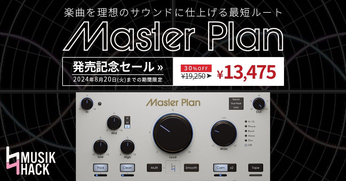 MUSIK HACK社は、音声技術に深く精通したプログラマーによってアメリカのカリフォルニア州で設立された新進気鋭のデベロッパーです。「アーティストの実現したいサウンドを、難解なテクニック無しで忠実に表現するサポートをしたい」という思いの下、研究・開発を重ねています。その悲願を達成する形でリリースされた『MASTER PLAN』は、プロのマスタリング・エンジニアが用いる様々な手法をシンプルなコントロール群へ落とし込み、アーティストが不要な手間をかけずに最高の形で作品を発表するための全てを凝縮した、まさに業界トップクラスのマスタリングツールです。