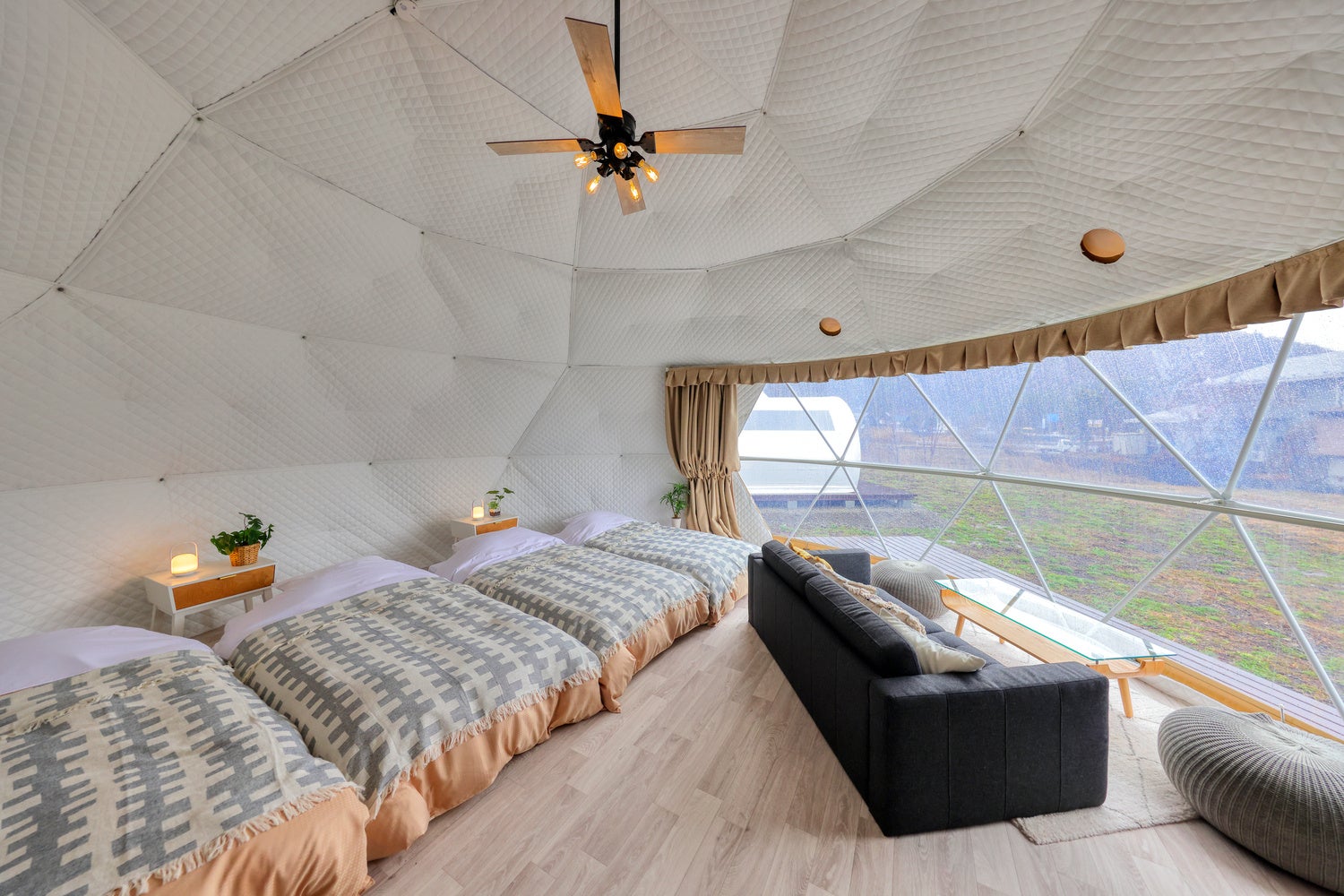 広大な敷地に大型のドームテントを5棟配置。 全棟冷暖房と4ベッドを完備した年中快適なホテル仕様の空間をご用意しております。 大切な方、ご家族・ご友人と富士河口湖の旅を堪能ください。