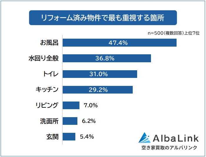 「リフォーム済み物件で最も重視する箇所」の1位は「お風呂(47.4%)」でした。2位「水回り全般(36.8%)」、3位「トイレ(31.0%)」、4位「キッチン(29.2%)」が続きます。
