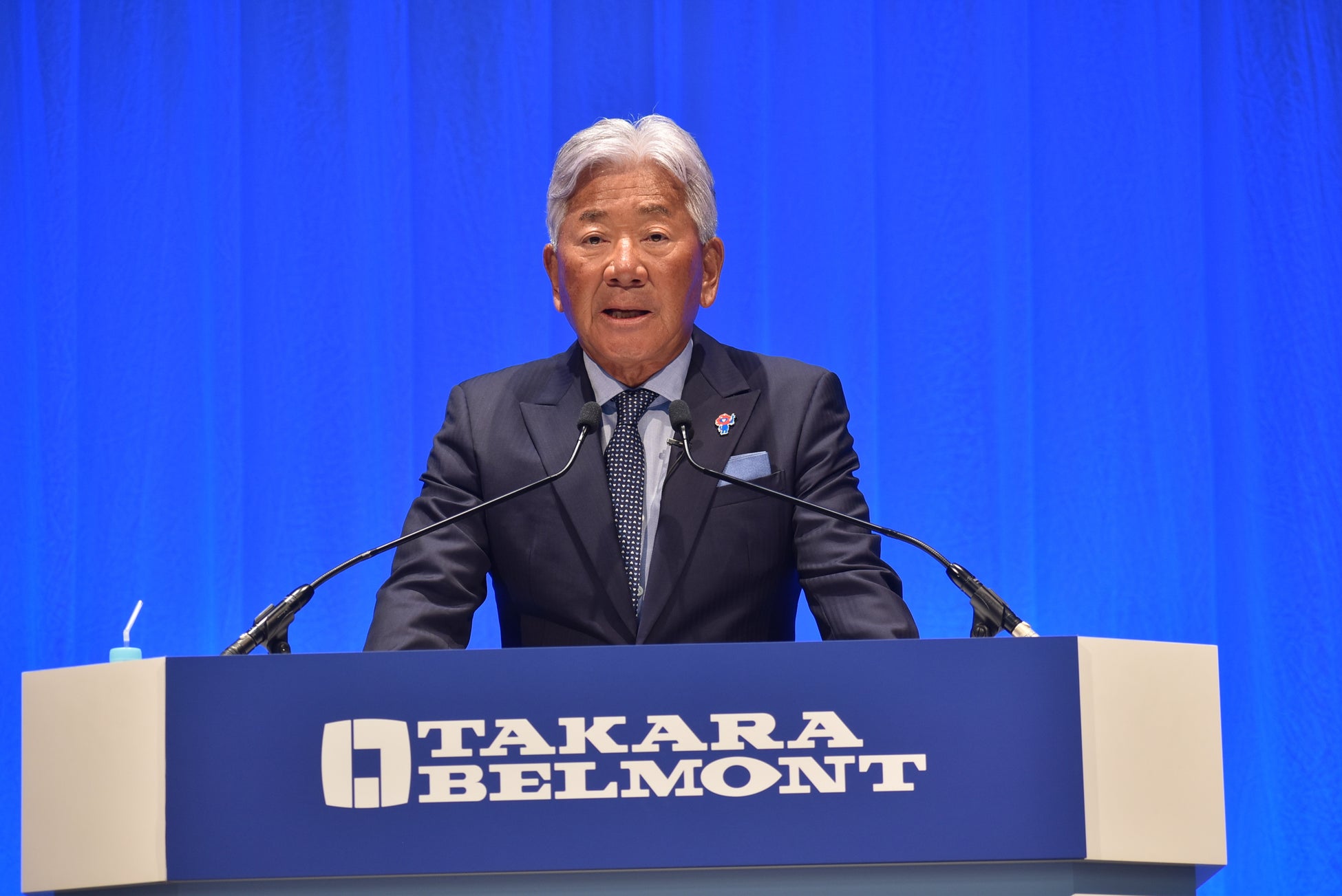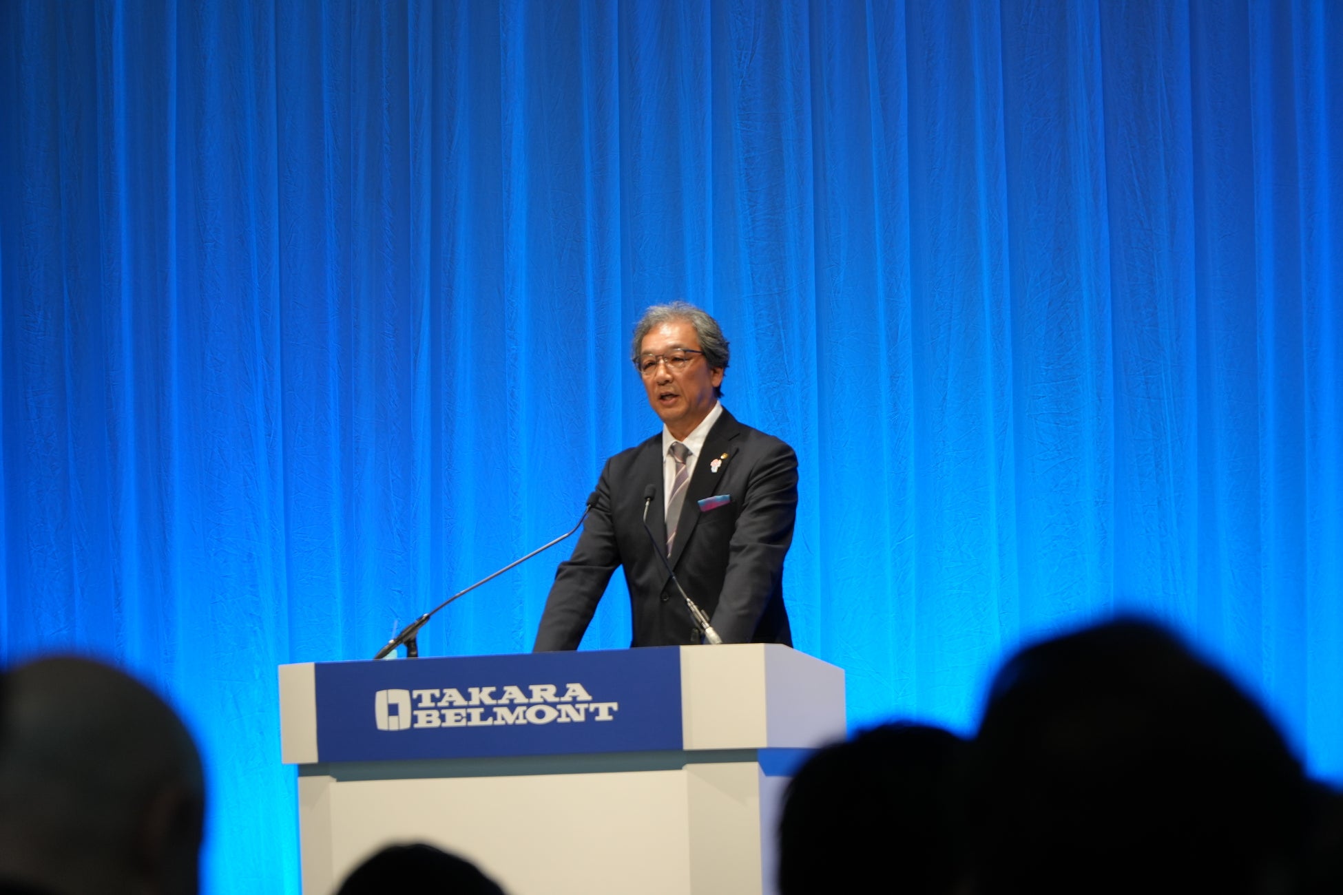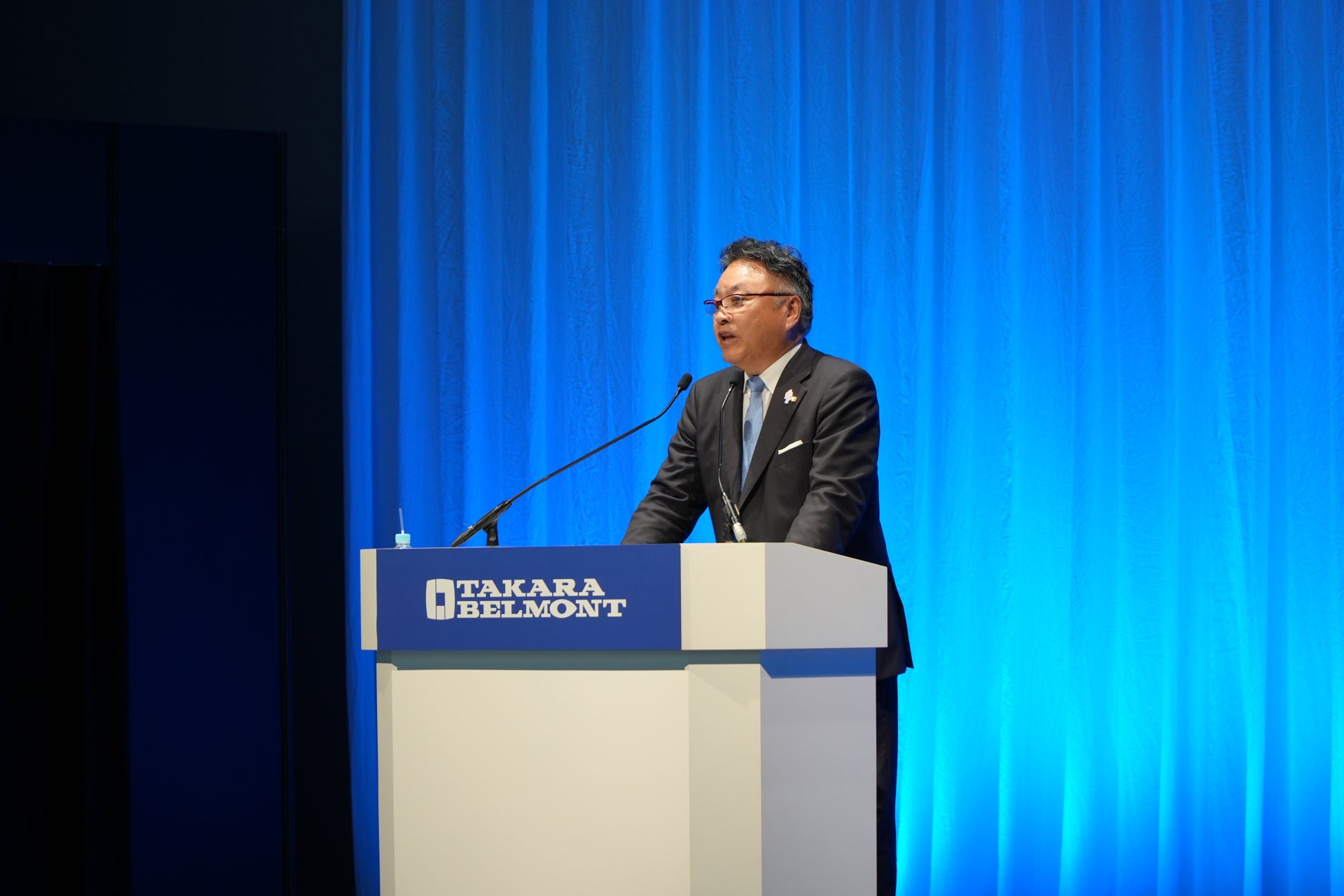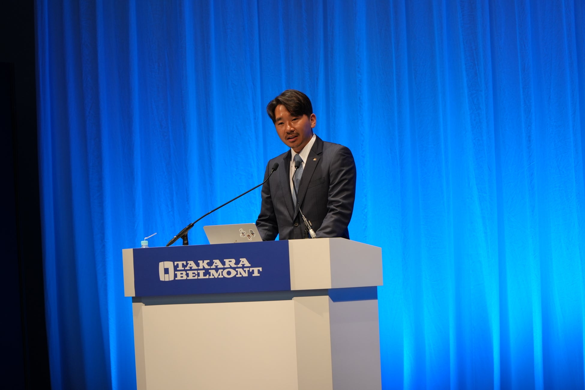 グループプレゼンテーションは、タカラベルモント103年の歩みと、それを支えてくださった参加者への感謝を示した動画からスタート。その後、タカラベルモント株式会社やグループ会社の代表・役員の紹介を、世界各国からのオンライン中継も交えながら行いました。