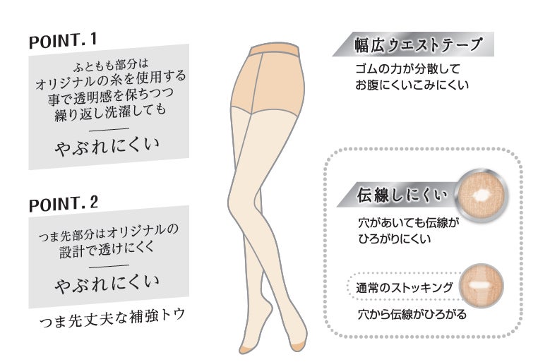 ふともも部分はオリジナルの糸を使用する事で透明感を保ちつつ、繰り返し洗濯してもやぶれにくくなっています。また、つま先部分はオリジナルの設計で透けにくく、長時間使用してもやぶれにくい仕様となっています。その他にも「抗菌防臭」「消臭」「静電防止」機能が備わっています。