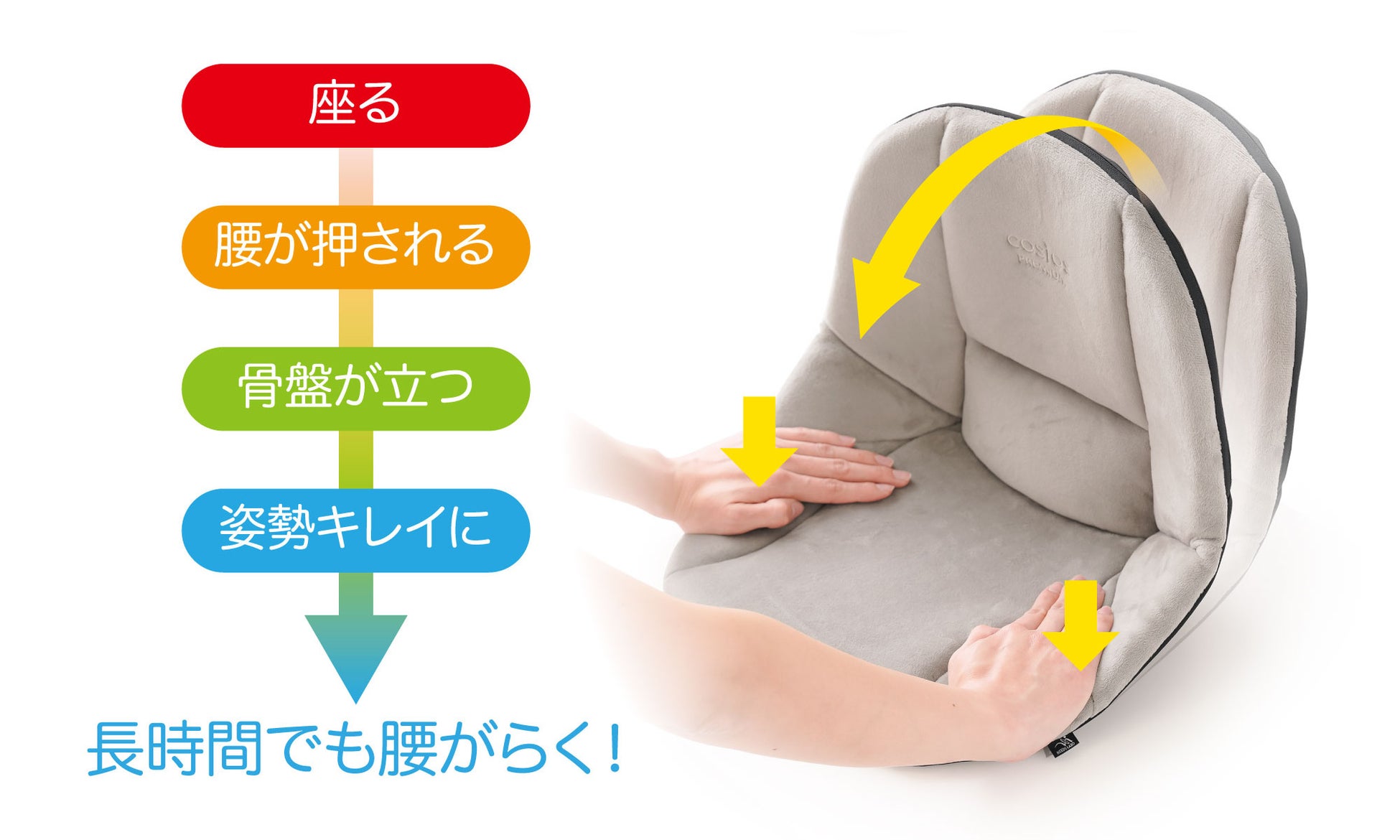 座る力で腰を押す!骨盤を起こし正しく美しい姿勢に導いて、腰を楽にするクッション!