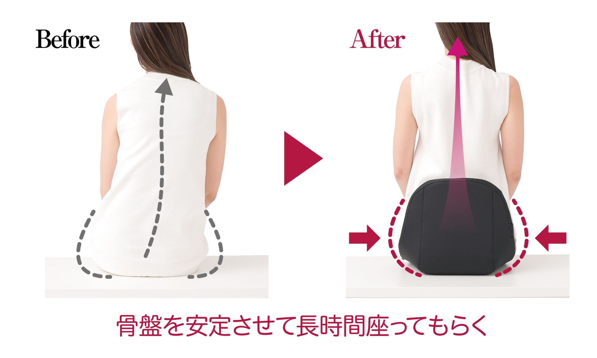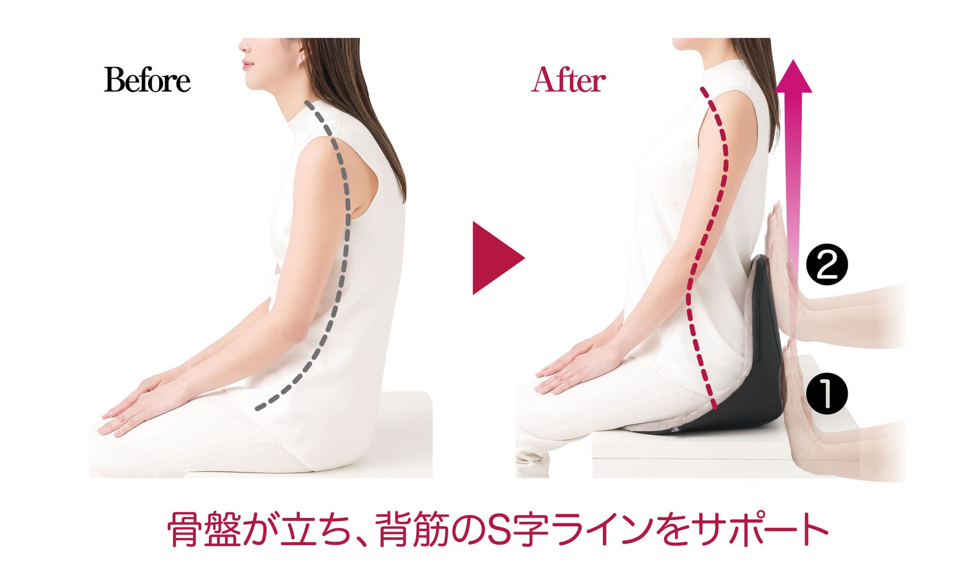 座ることで自重により後ろから腰・背中を二段階に押されるので、骨盤の後傾を防ぎ、背筋のS字ラインをキープ!正しい姿勢をサポートします。