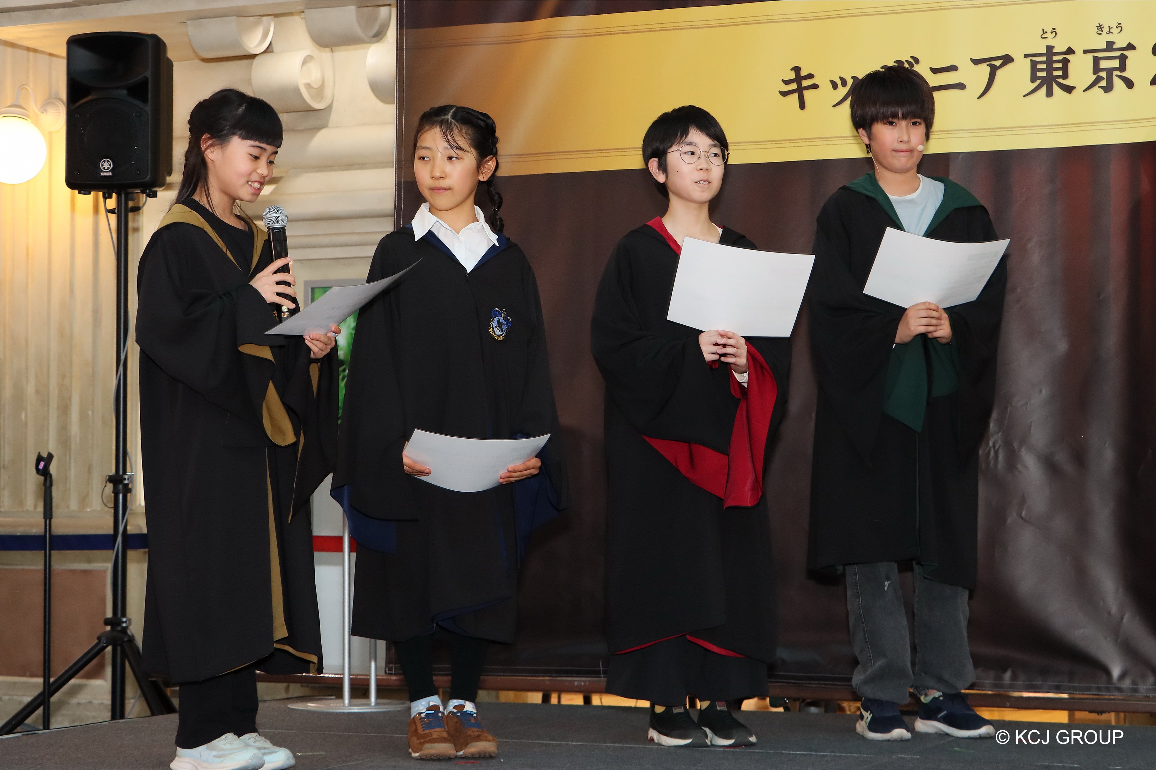 こども達はホグワーツ魔法魔術学校のローブを身にまとい、スーパーバイザーの進行のもと、ストレッチや台本の読み込み、役柄紹介までを本格的に体験。こども代表1名が佐藤さん、出口さんとともに舞台『ハリー・ポッターと呪いの子』のワンシーンを演じました。佐藤さん、出口さんからのアドバイスを受け、物語の中心人物である少年を力強く演じたこどもの姿に、会場からは大きな拍手が送られました。