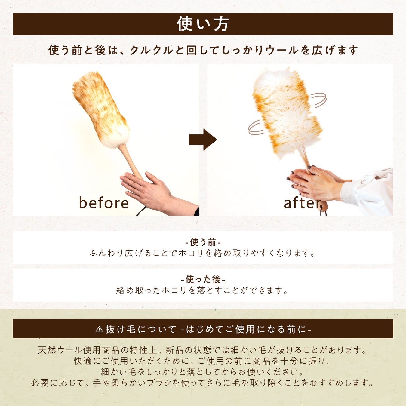 本製品は、オーストラリア産の高品質なメリノウールを100%使用し、優れたホコリ取り性能と洗練されたデザイン性を兼ね備えた掃除アイテムです。