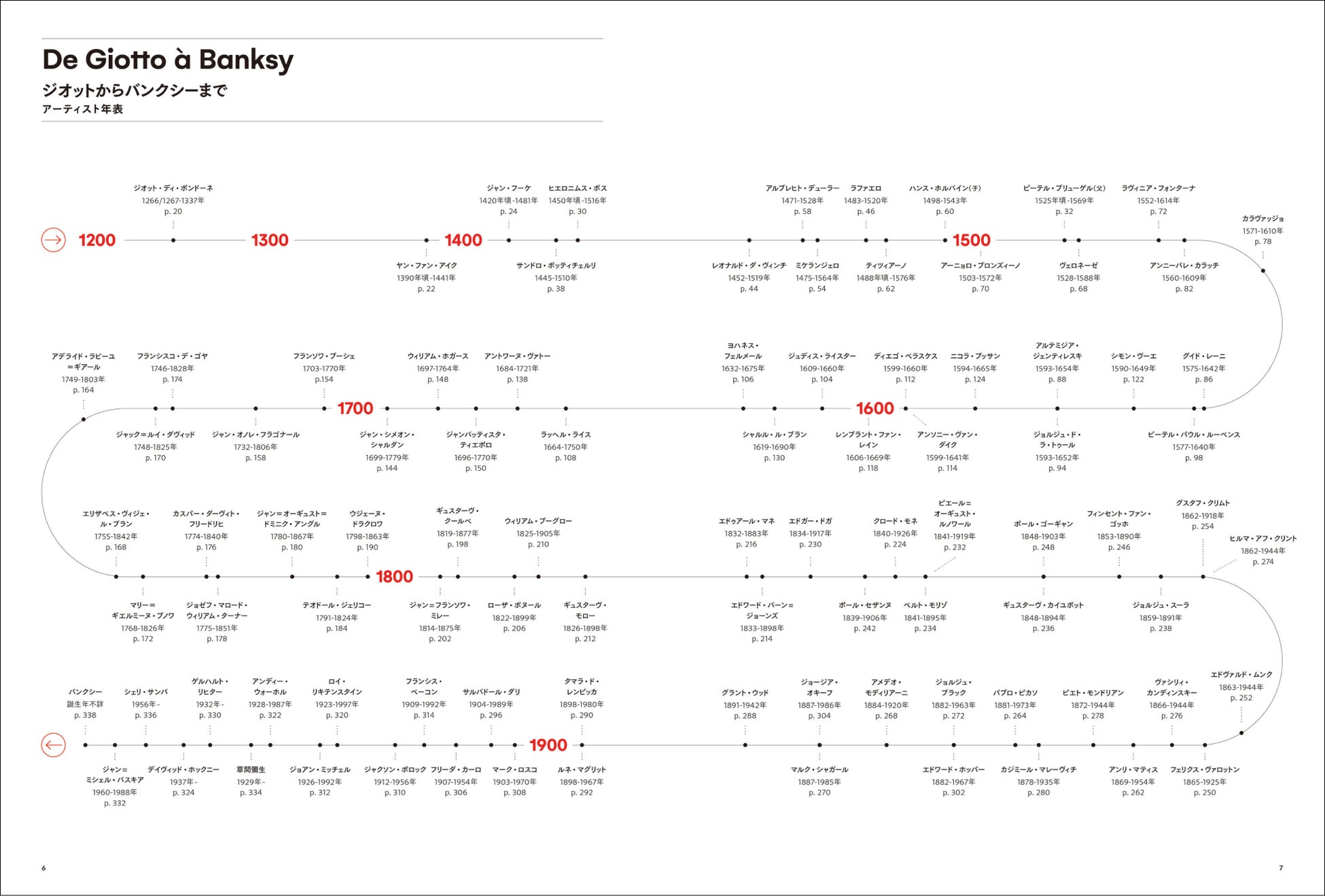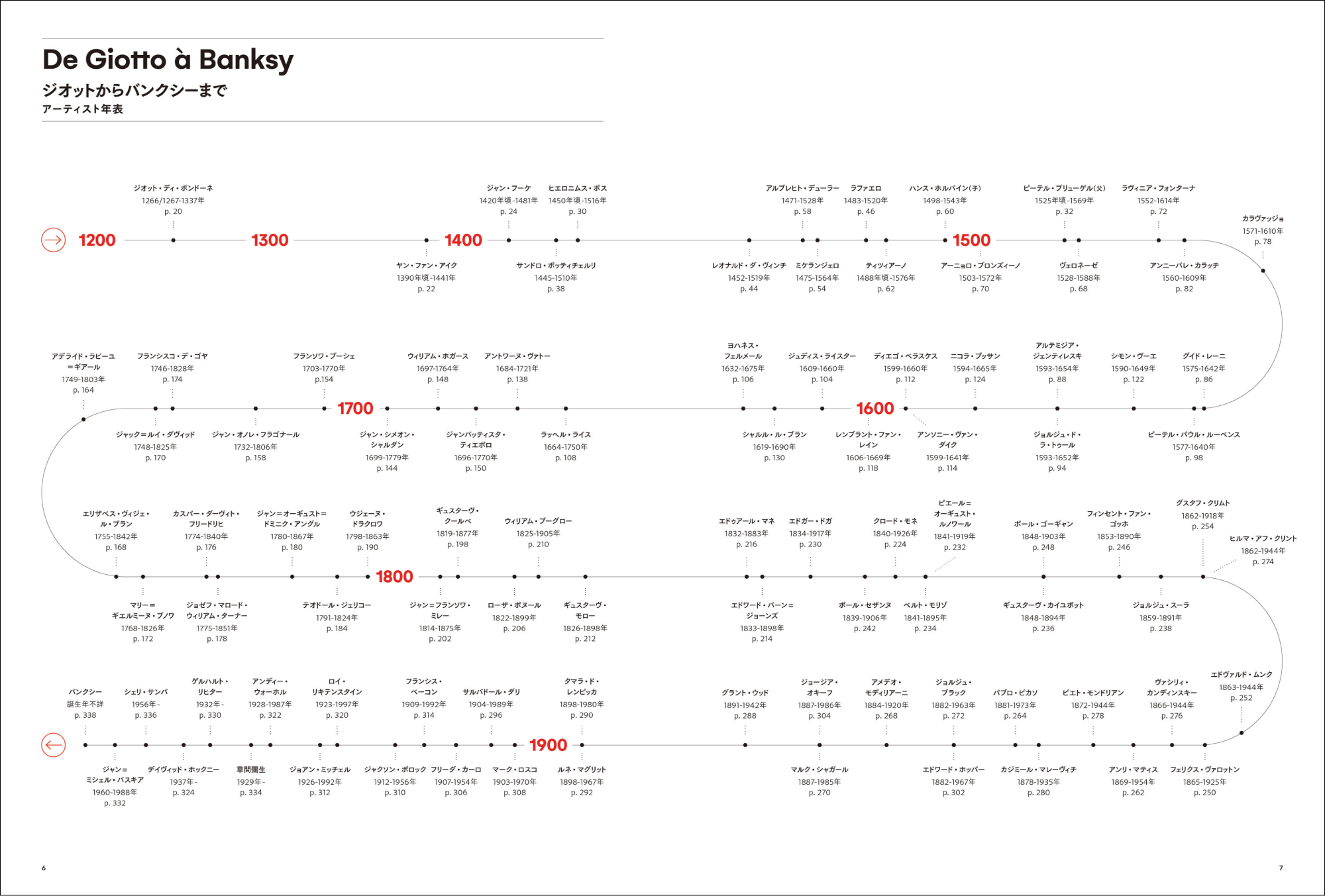 ◆アーティスト年表:1200年、イタリア・ルネサンスへの先鞭を付けた偉大な芸術家と言われるジオット・ディ・ボンドーネからはじまり、1900年代の日本の代表的な芸術家、草間彌生。素性不明のアーティスト、バンクシーまで100人の歴史的アーティストを紹介。
