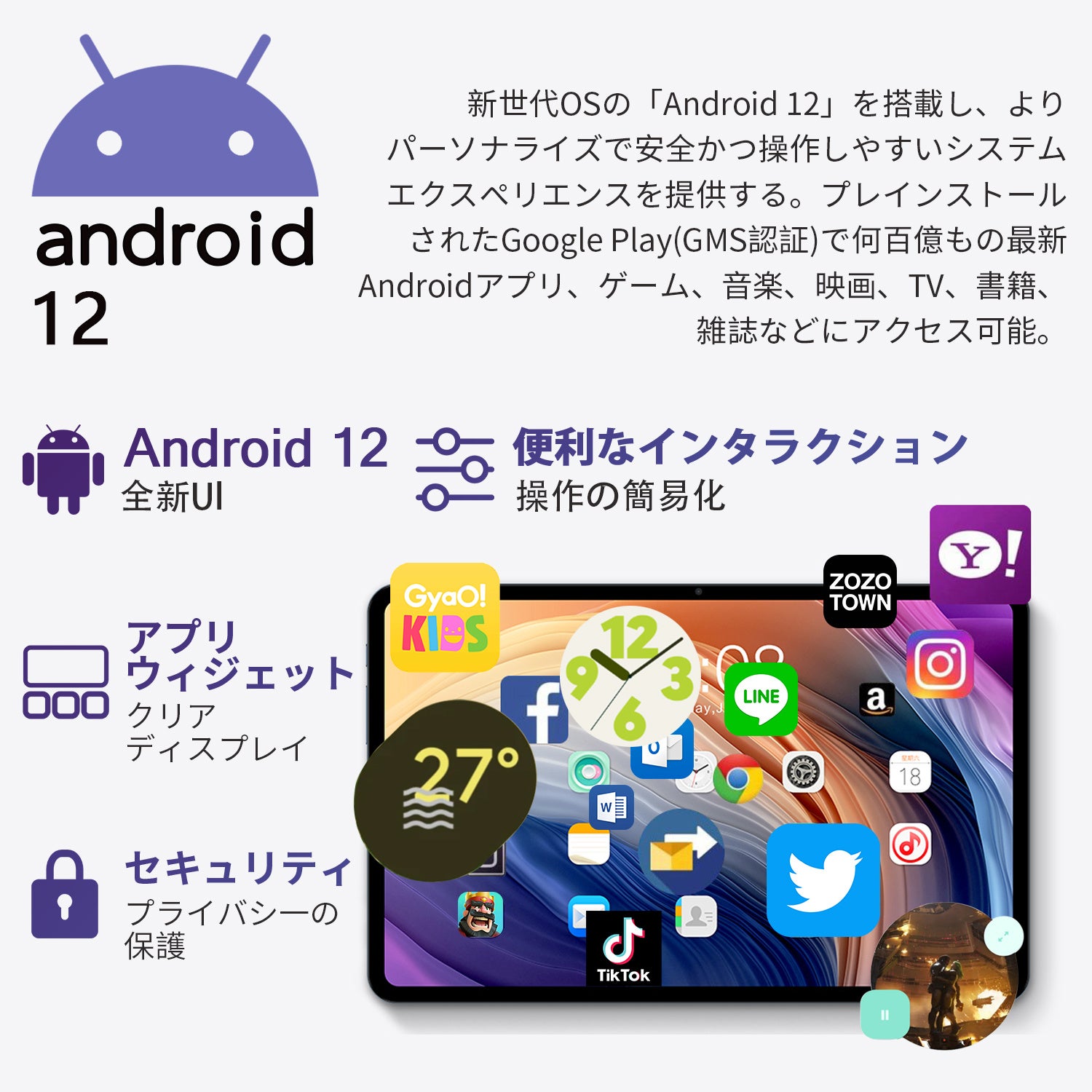 T40 Pro タブレットは8GBのメモリと128GBの高速ストレージを搭載し、豊富な動画、電子書籍、ゲーム、音楽をダウンロードできます。MicroSD(TF)カード(FAT32だけサポート)を併せるとさらに1TBまでメモリ拡張でき、容量不足の心配は不要です。新世代のAndroid12.0 オペレーティングシステムを搭載、ダークテーマ、ジェスチャーナビゲーション、デジタルヘルス、カスタムアイコンシェイプなどよりスマートで便利なユーザーインターフェースでより快適な操作が楽しめます。