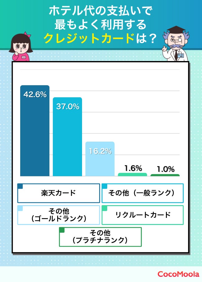 ホテル代の支払いで最もよく利用されているクレジットカードは「楽天カード」で、全体の約43%を占める。