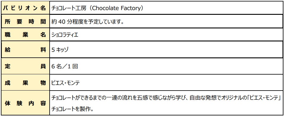 このパビリオンは、おいしいチョコレートを追求し続ける江崎グリコとKCJ GROUPが考案したアクティビティです。チョコレートができるまでの工程を学び、子どもたちの自由な発想でピエス・モンテを作り上げるショコラティエ体験を通じて、チョコレートの奥深さを五感で体感する機会を提供します。