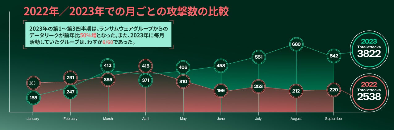 2023年第1~3四半期において、ランサムウェアグループからのデータリークは前年同期比で50%増加した。