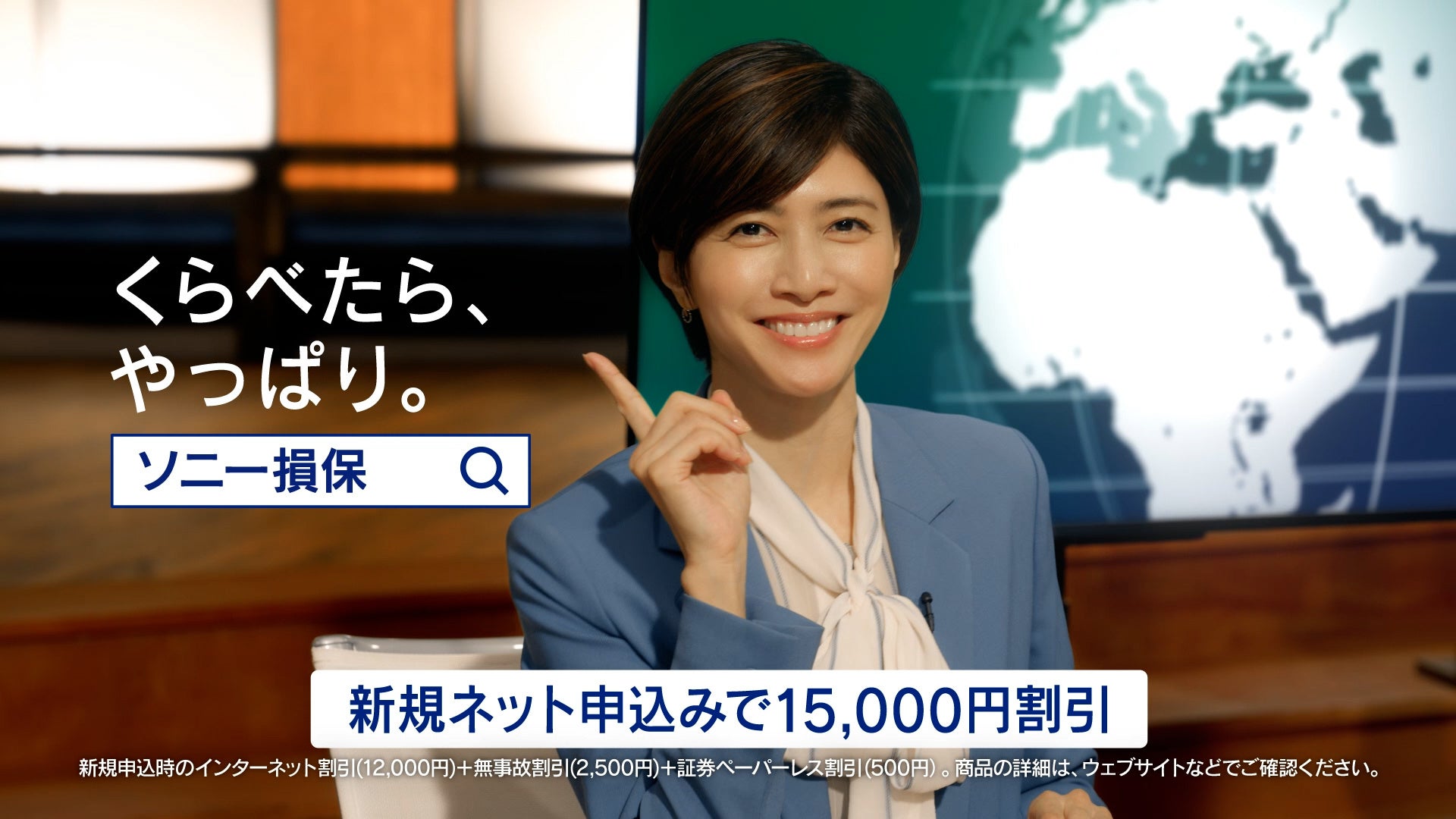 内田さんがニュース番組のキャスターとして登場し、ソニー損保の自動車保険の商品・サービスを紹介しつつも、思わず本音をのぞかせるストーリーとなっています。チャーミングな内田さんの演技にもご注目ください。