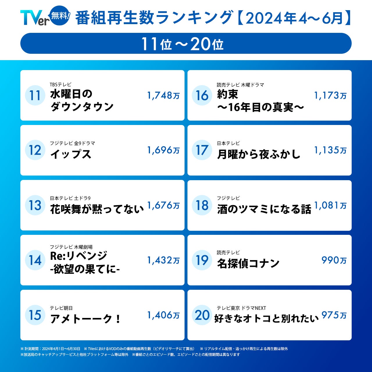 民放公式テレビ配信サービス「TVer(ティーバー)」より、2024年4-6月の全配信番組を対象とした「番組再⽣数ランキング」上位20番組をお知らせします。