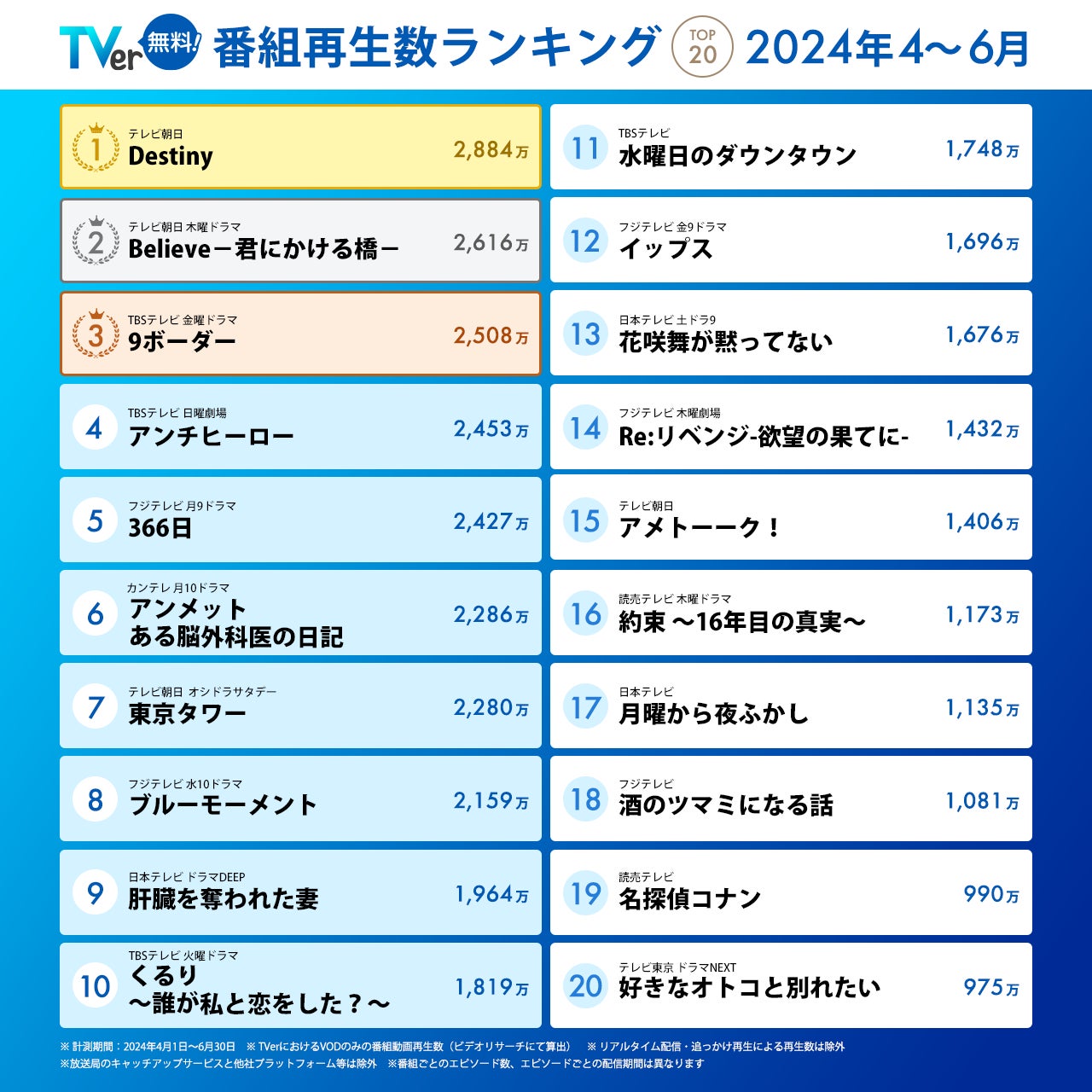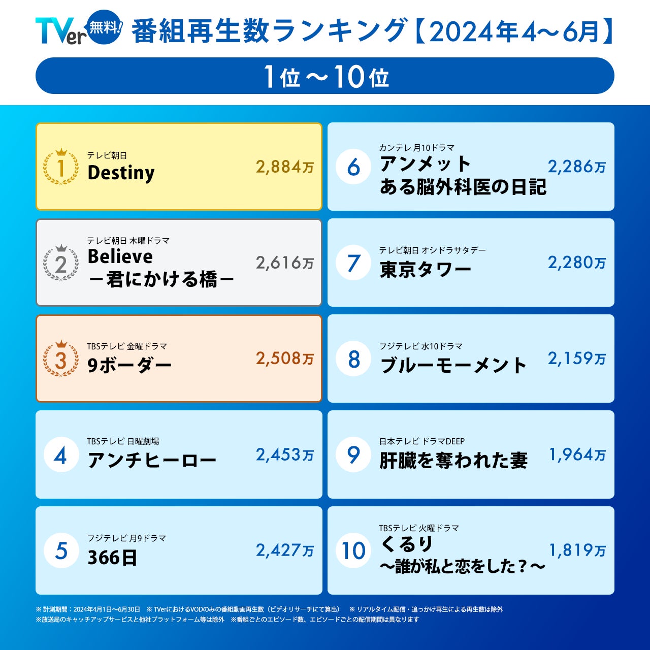【TVer】2024年4-6月 番組再生数ランキング 1位はテレビ朝日『Destiny』