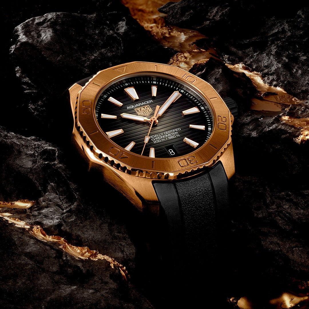 2つの新モデルは、高性能なスイスの高級ツールウォッチにハイエンドかつ印象的なタッチを加えています。タグ・ホイヤーのアクアレーサーとしては初めて、ケースとベゼルにゴールドを使用した新世代モデルとなります。