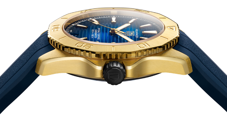 タグ・ホイヤー アクアレーサー プロフェッショナル200 の両モデルはハイエンドなプロフィールに合致する美しいグラデーションのダイヤルを備え、18Kソリッドゴールド製ケースが高級感を強く印象付けています。ローズソリッドゴールドのモデルは、中央のブロンズ調のグレーへのグラデーションが美しいブラックのダイヤルが特長です。イエローソリッドゴールドのモデルはダイヤルの中心がブルーに輝き、まるで水中洞窟から発せられる光のような趣です。