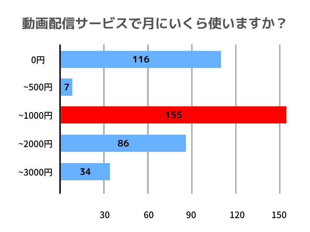 動画配信サービスに使っている費用は、月額500円〜1000円の人が155人と一番多い結果になりました。次いで、116人が「0円」、86人が「1000円〜2000円」と回答しています。