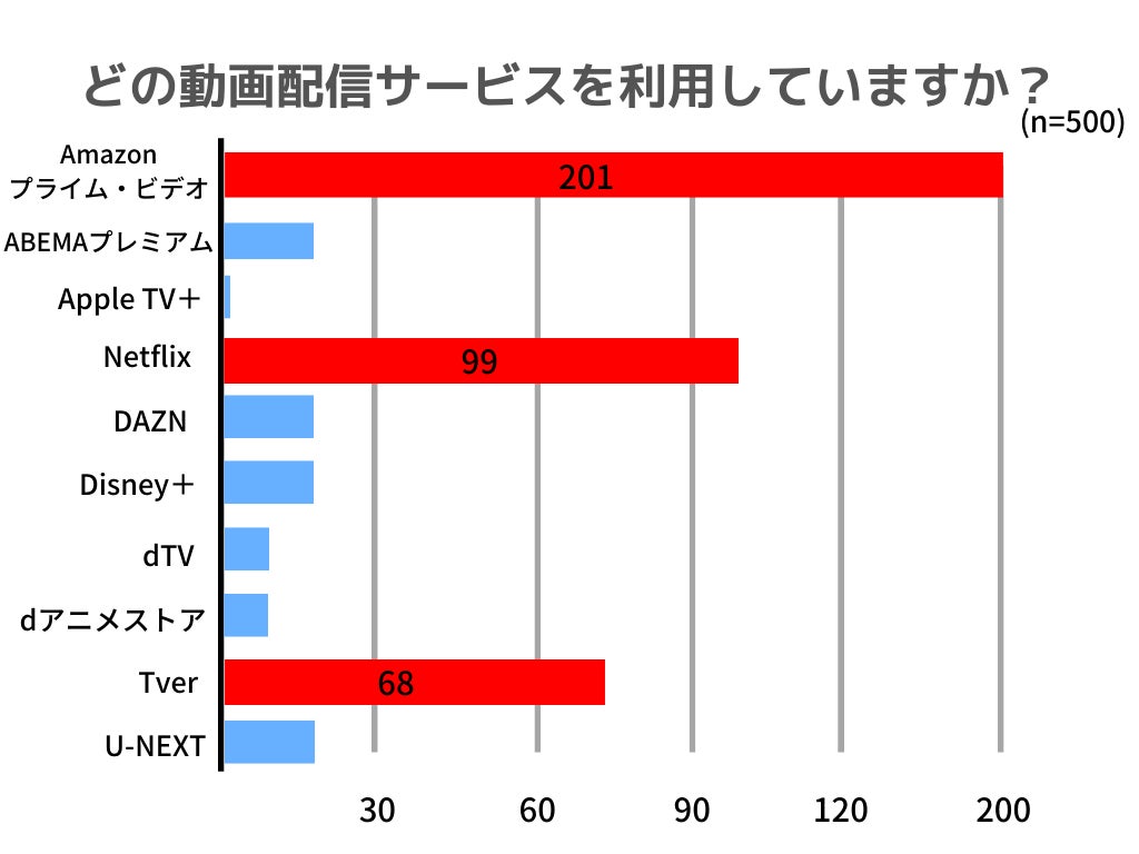 現在利用している動画配信サービスは、「Amazon プライム・ビデオ」が201人で1位になりました。