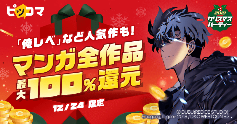 ピッコマでは現在、12/1(水)より、12月が毎日お得に楽しめるクリスマスイベント「クリスマスパーティー2021」を開催しております。本日12/24(金)のクリスマスイブは、ラストを締めくくる目玉企画として、24時間限定で、 12/24(金) の作品購入金額に応じて最大100%相当のコインが還元される特大イベントが実施されます。対象作品はピッコマで配信中の全7万作品。