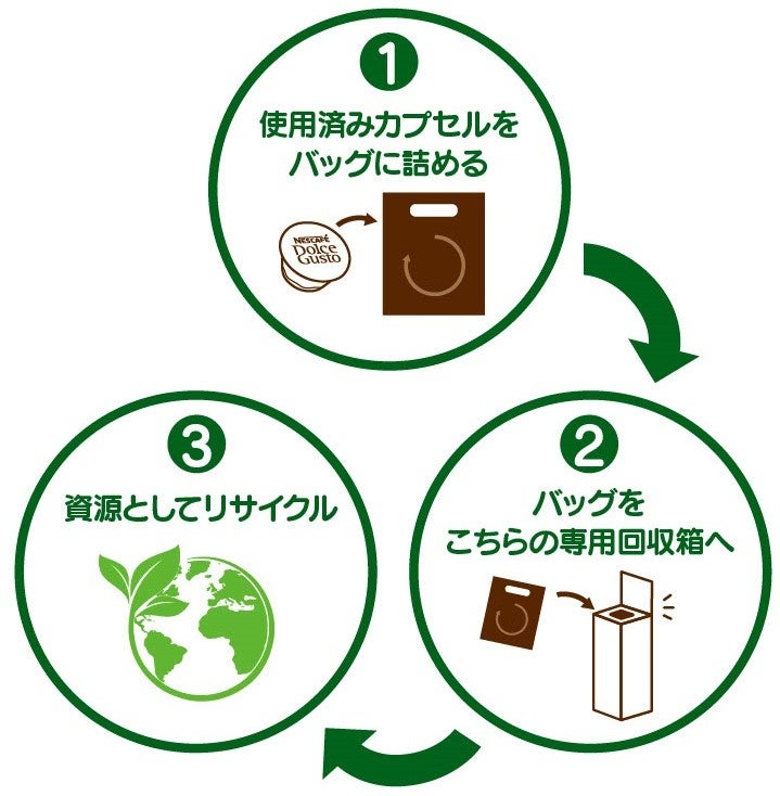①「ネスカフェ ドルチェ グスト」の使用済みのカプセルを専用袋に入れて、回収店舗まで持参する。