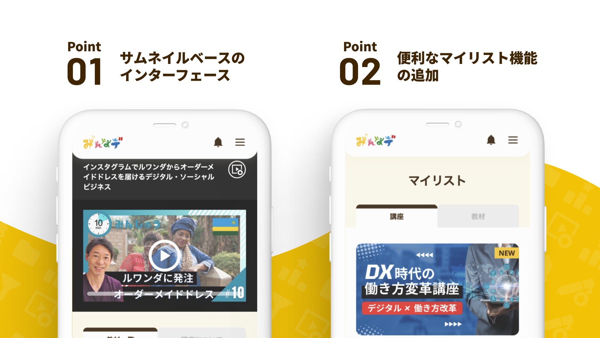 今回のみんなデのリニューアルでは、モバイルファーストのデザインにするなどUIの向上を実現するリニューアルにより、受講者により優れた学習環境を提供可能としました。具体的なリニューアルのポイントは下記の通りです。