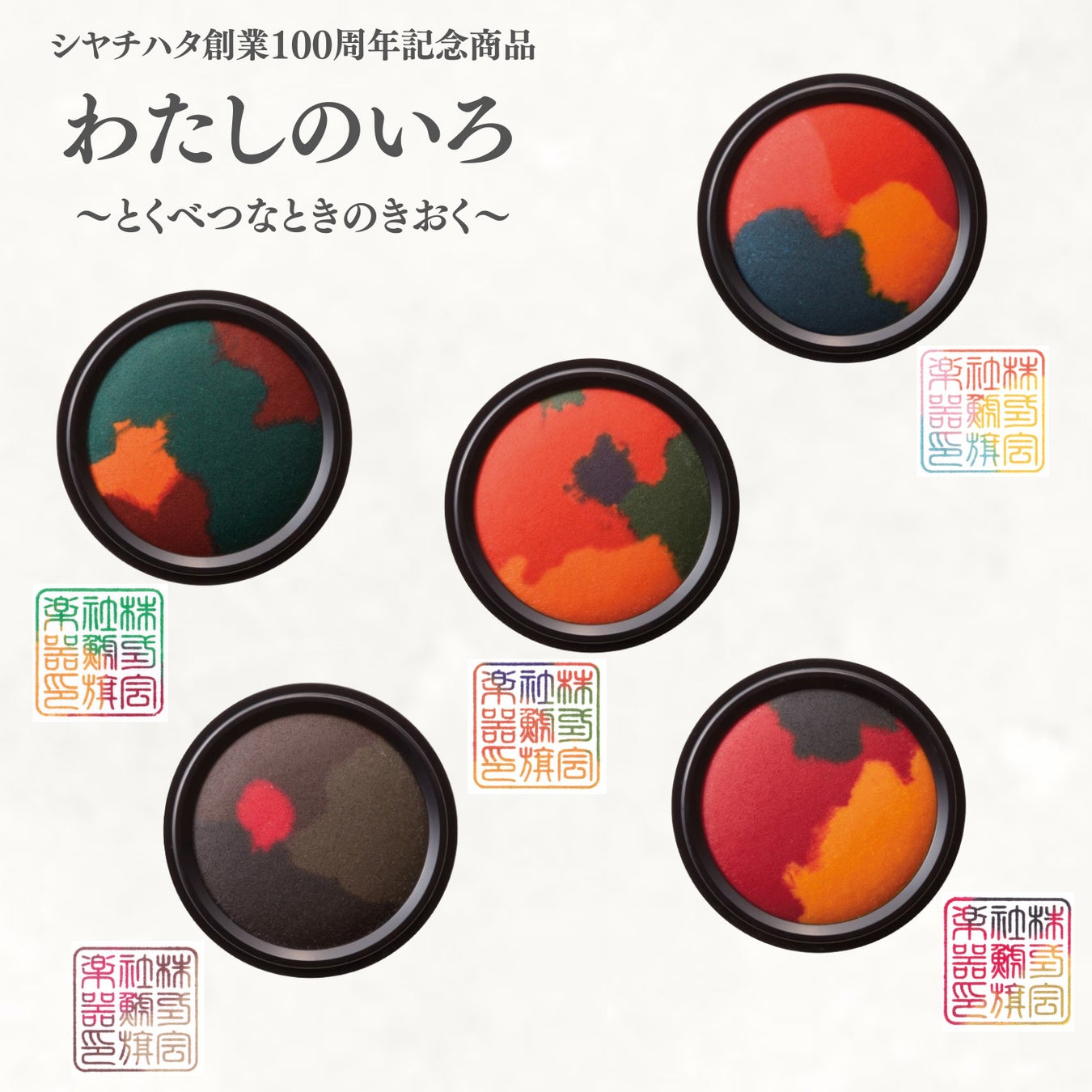 複数の色を織り交ぜた色鮮やかな朱肉「わたしのいろ」から、シヤチハタの創業100周年記念商品として、誕生日やクリスマス、バレンタインなど「特別な時」をテーマにした、第四弾「わたしのいろ-とくべつなときのきおく-」の全5種類が文具女子博に初登場します。