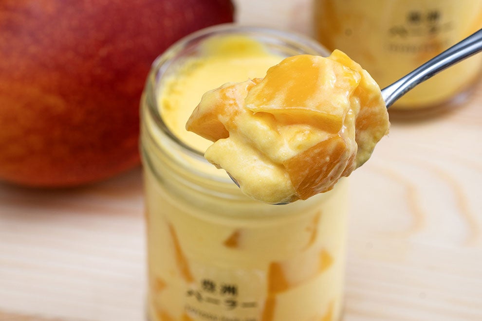 スイーツに使う果実は、打ち身やキズのある店頭には置けないものを使うことが一般的です。しかし今回は、豊洲パーラーとしてふさわしい品質を追求し、ゴロゴロと瓶に詰める果肉には、JA認証の「みやざき完熟マンゴー」のみを使いました。アーウィン種のマンゴーを自然に落果するまで樹上で完熟させるので、濃厚な甘みと芳醇でとろけるような果肉が楽しめます。
