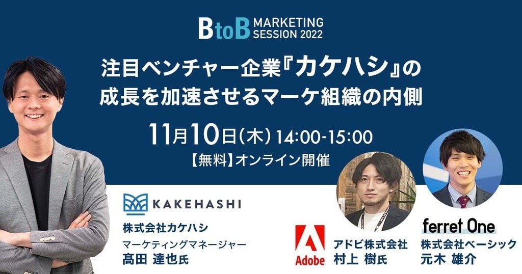 オールインワン型BtoBマーケティングツール『ferret One(フェレットワン)』を運営する株式会社ベーシック(本社:東京都千代田区、代表取締役:秋山勝、以下当社)は11/10(木)14時より、デジタルマーケティングに取り組むBtoB企業の担当者の方に向けたイベント「BtoB Marketing Session 2022 〜注目ベンチャー企業『カケハシ』の成長を加速させるマーケ組織の内側〜」を開催いたします。