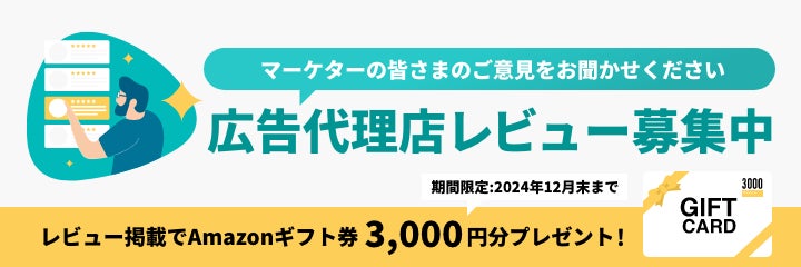 2024年12月末までにアドフープに加盟している広告代理店のレビュー評価を投稿、掲載された方には謝礼としてAmazonギフト券3,000円分を贈呈いたします。実際に広告運用を発注された広告主企業のレビュー評価は他の広告主企業にとっても非常に貴重な情報だと考えておりますので、ぜひレビュー評価の投稿にご協力をお願いいたします。