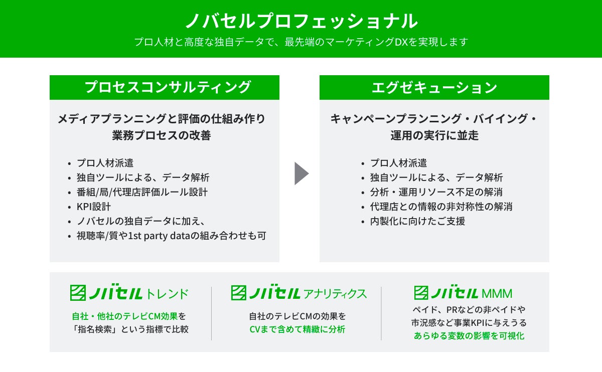 「ノバセル プロフェッショナル」は、メディアプランニングと評価の仕組み作り、業務プロセスの改善をサポートする「プロセスコンサルティング」とキャンペーンプランニング・バイイング・運用の実行に並走する「エグゼキューション」の2つのプランを用意しています。