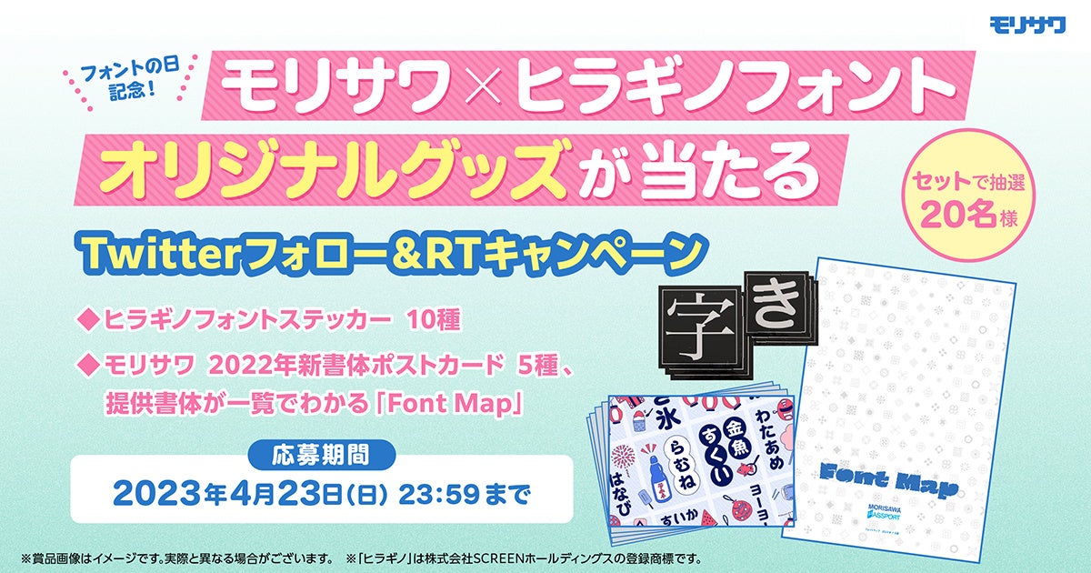 株式会社モリサワは、4月10日の「フォントの日」を記念し、2023年4月10日(月)〜2023年4月23日(日)の期間、特別コラボレーション企画として、ヒラギノフォントとモリサワのオリジナルグッズがセットで当たるTwitterフォロー&リツイートキャンペーンを実施します。