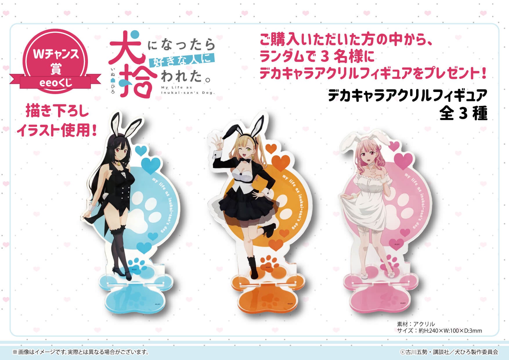 バニーガール衣装を着た犬飼さん、猫谷、月城の描き下ろしイラストを使用し、華やかな景品が大集合したTVアニメ『犬になったら好きな人に拾われた。』の「eeoくじ」。