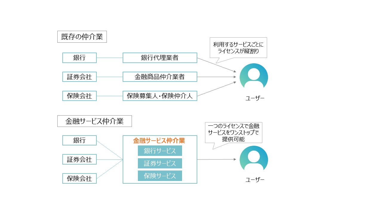 金融サービス仲介業とは、一つのライセンスで「銀行・証券・保険」すべての分野の金融サービスをワンストップで仲介可能とする新たな業種で、2020年6月に金融商品販売法が「金融サービスの提供に関する法律」に改正された際に創設され、2021年11月に施行されました。