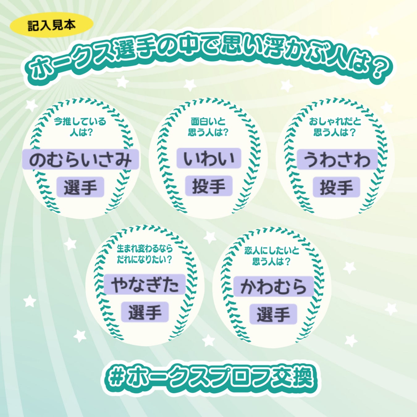 応募方法はアカウントのフォローと、あなたの思い浮かぶ選手をプロフィールシート画像に記入し、「#ホークスプロフ交換」をつけてポストするだけ♪たくさんのご参加お待ちしております!