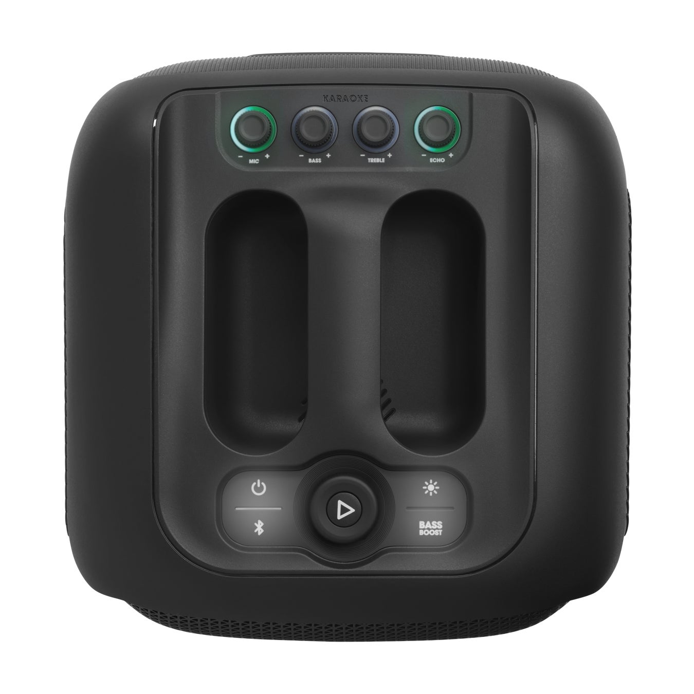 本モデルは、JBLオリジナルのデジタル・ワイヤレスマイクを1本付属で装備しています。マイク正面の音声を収音する「単一指向性」のため、大音量でのカラオケやストリートパフォーマンスなど、周りに様々な音があるような環境でも効率的に声を拾います。2.4GHz 無線方式を採用しているため、コードが絡まる煩わしさもなく、マイクの電源をOnにするだけで誰でも簡単にお使いいただけます。また、マイクパフォーマンスに欠かせないエコー調整なども本体天面のノブおよび専用アプリ「JBL PARTYBOXアプリ」から操作できるため、曲や場面、お好みに応じて理想の音を創り出すことが可能です。さらに、本体への接続は最大2本まで可能なため、別売りのマイクをもう1本ご購入いただくことで、カラオケでデュエットなどもお楽しみいただけます。