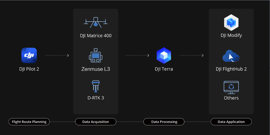 Zenmuse L3はDJIのエコシステムとシームレスに統合することができ、ワンストップのマッピングソリューションを提供します。エコシステムには、D-RTK 3多機能ステーション、DJI Pilot 2、DJI Terra、DJI Modify、DJI FlightHub 2が含まれ、それらと連携して利用することが可能です。データ取得から処理、活用まで、この統合ワークフローは従来のマルチプラットフォーム構成より操作が簡単で、幅広いマッピング作業を効率的に完了させることができます。