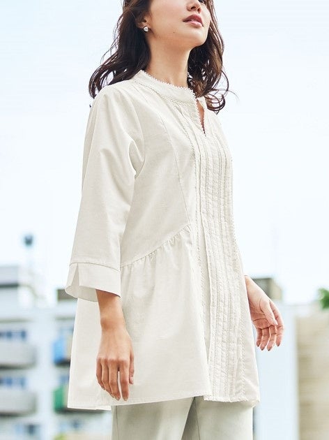 綿の裁断くずや落ちわたを集めて作った糸を使用した「リサイクルコットン100%」素材のブラウス。