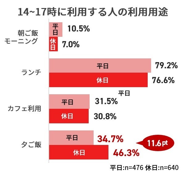 着目したのが、利用者が少ないランチタイムとディナータイムの境目の時間(14時~17時)です。ランチ利用が平日・休日ともにそれぞれ8割近くおり最多でしたが、これに次いだのは、カフェ利用ではなく、ディナー利用でした。早めの夕ご飯で利用する人も多く、特に平日よりも休日のほうが割合の多い(11.6ポイント差)傾向にあります。