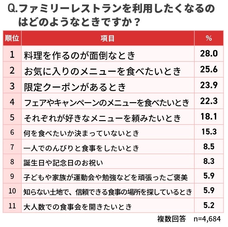 ファミリーレストランを利用したくなるのはどんなときかを聞きました。トップは「料理を作るのが面倒なとき」(28.0%)でした。これに関連するように、5位「それぞれが好きなメニューを頼みたいとき」(18.1%)、6位「何を食べたいか決まっていないとき」(15.3%)もランクインしています。それぞれがメニューを自由自在に選べることから、夕飯や休日のお昼など、献立を考えるのが面倒なときの味方になってくれるのもファミリーレストランのいいところです。