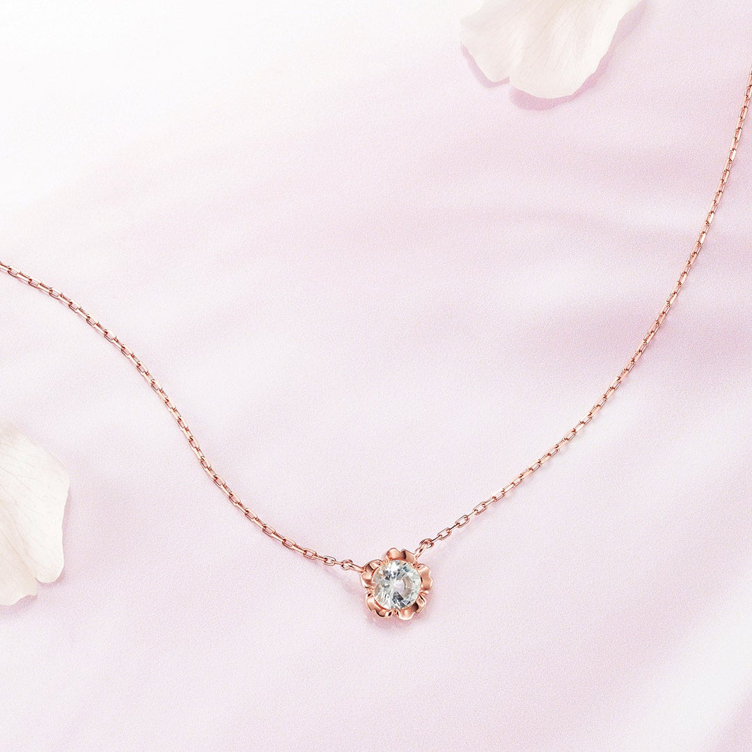 夜の月明りに照らされる桜をイメージしたプラチナ素材のジュエリーも。中心に夜空を連想させる深いブルーのロンドンブルートパーズをセッティングし、ダイヤモンドの繊細な輝きで5枚の花びらを縁取ることでブルーを上品に際立たせたデザインは、幻想的で凛とした佇まいを醸し出します。プラチナの洗練された輝きとデイリーにも身に着けやすいサイズ感はプレゼントにもおすすめのアイテムです。