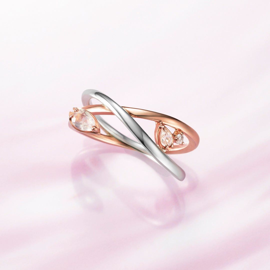 桜が舞い散り水面に浮かぶ情景をジュエリーに落とし込んだシリーズも。ピンクゴールドカラーとプラチナカラーが重なる可憐なコンビカラーのアイテムは、桜の華やかさの中にも軽やかさを感じさせる大人っぽい雰囲気に。
