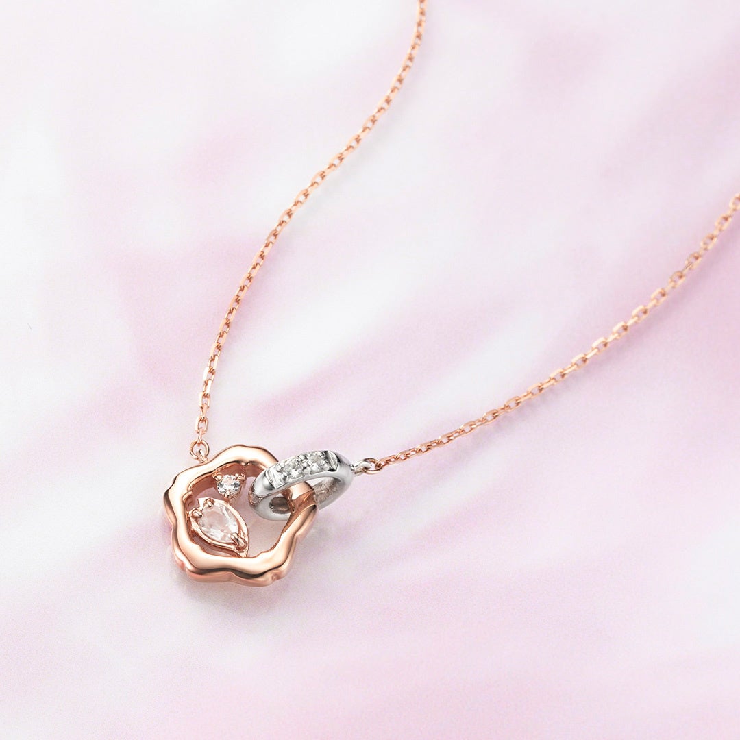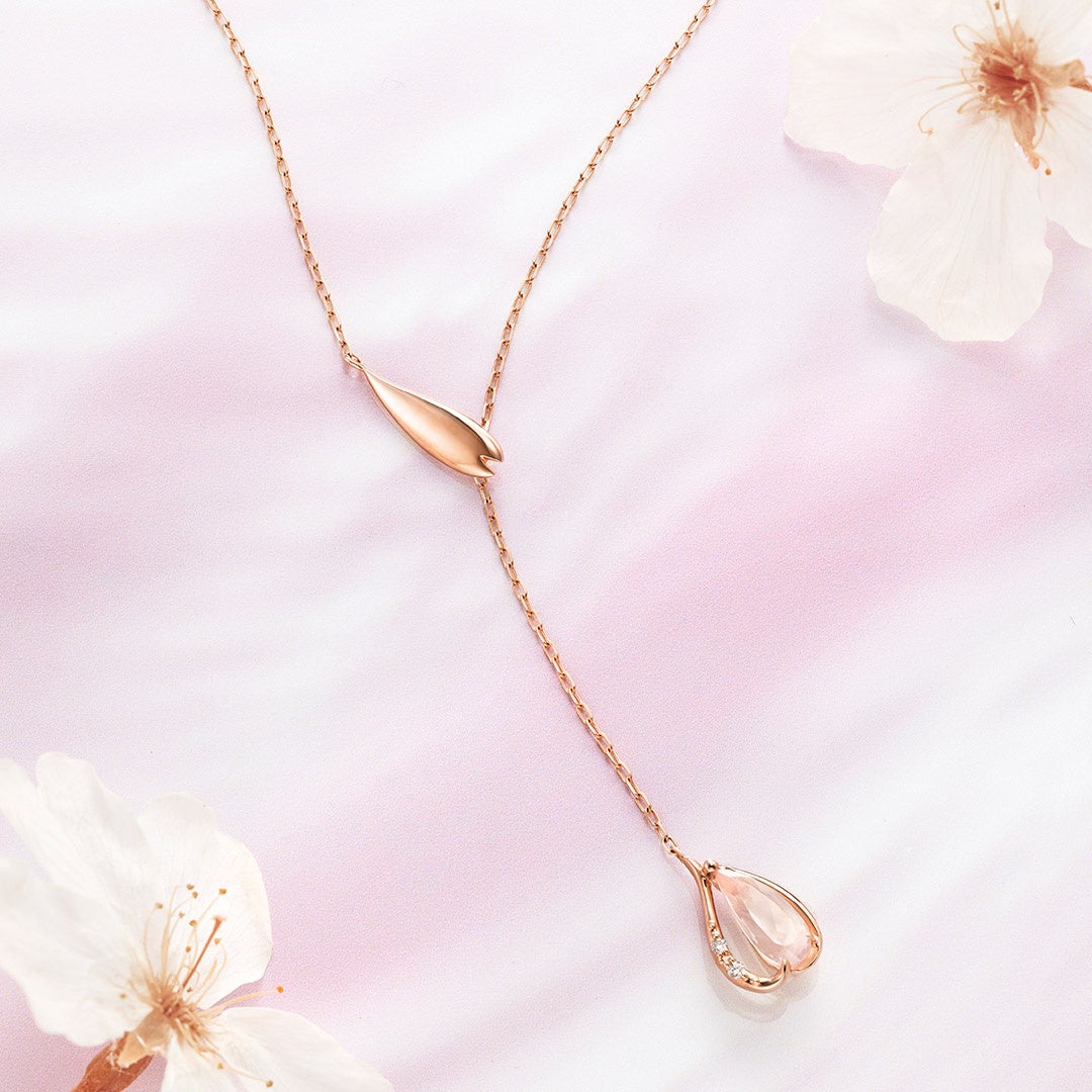 5枚の花びらが立体的なフォルムで花開く、愛らしいデザインのジュエリーも。ピンクゴールドの地金にローズクォーツやホワイトトパーズを添えたネックレスやブレスレットは、ペアシェイプやラウンドカットなど天然石に様々なカットを施すことで煌びやかに仕上げました。5枚の花びら一枚一枚を全て異なったデザインで満開の桜を表現したラリエット風ネックレスやリングセットも登場。満開の桜のようにも、舞い落ちる花びらのようにもアレンジできる2Way仕様で、気分に合わせて自在に着用していただけます。