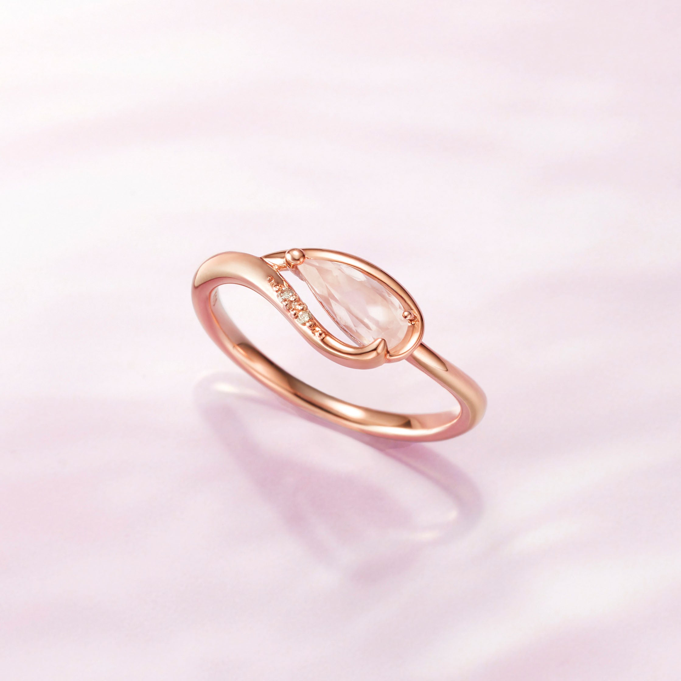 しなやかな花びらのフォルムを可憐で甘すぎないすっきりとしたシェイプで象った、4℃オリジナルカット「Petal Cutting」を施したローズクォーツが煌めくネックレス、ピアス、リングが登場。淡いピンクカラーのローズクォーツは美や愛、優しさといった意味を持ち、身に着ける人の美しさと優しい印象が際立つデザインに仕上げました。風に舞い落ちていく花びらをイメージしたラリエット風ネックレスは、先端の花びらのパーツが胸元で上品に揺れる度ローズクォーツが輝く華やかなデザインに。左右でデザインの異なる遊び心を閉じ込めたアシンメトリーのピアスや桜の花びらが指に舞い落ちてきたかのような、しなやかな印象のリングもご用意。耳元や手元でも、一枚の花びらが儚くも華やかに輝きます。