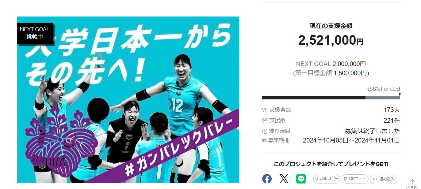 筑波大学女子バレーボール部、クラウドファンディング「#ガンバレツクバレー 大学日本一からその先へ」、目標を168%達成して終了!