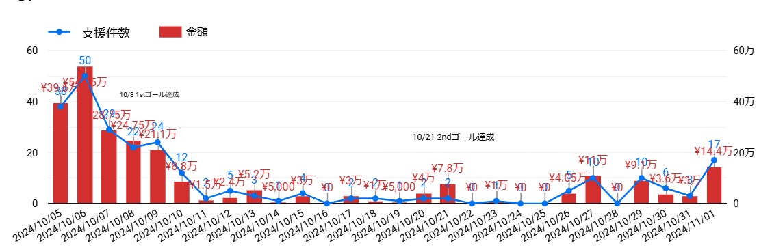 2024年10月5日から11月1日までクラウドファンディングプロジェクトを実施しました。221件と多くのご支援をいただき、目標金額150万円を大きく達成し、ネクストゴールであった200万円も達成することができました。