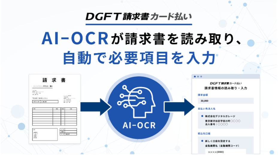 株式会社デジタルガレージ(東証プライム 4819、本社:東京都渋谷区、代表取締役 兼 社長執行役員グループCEO:林 郁、以下:DG)は、当社が提供するB2B決済サービス「DGFT請求書カード払い(https://lp.dginvoice.jp/)」(※1)に、このたび、AI-OCR(※2)を活用した請求書の自動読み取り機能を追加しましたのでお知らせいたします。本機能により、手入力が必要な項目が1/10以下になり、よりスムーズな支払い手続きが可能となります。