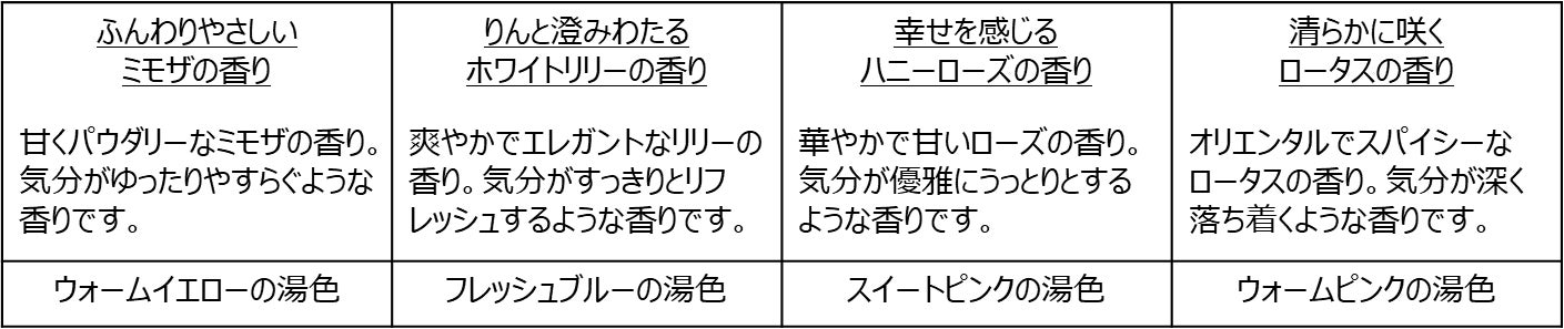 入浴によって得られる作用は3つ(温熱作用、水圧作用、浮力作用)あり、中でも浮力作用は、お湯に入ると身体が浮力を受けて軽くなりだるさを感じなくなるため、心身ともにリラックスします。よりリラックスした気分を味わいたい時にオススメする入浴剤として、『温泡 フローラルシーン』を開発しました。