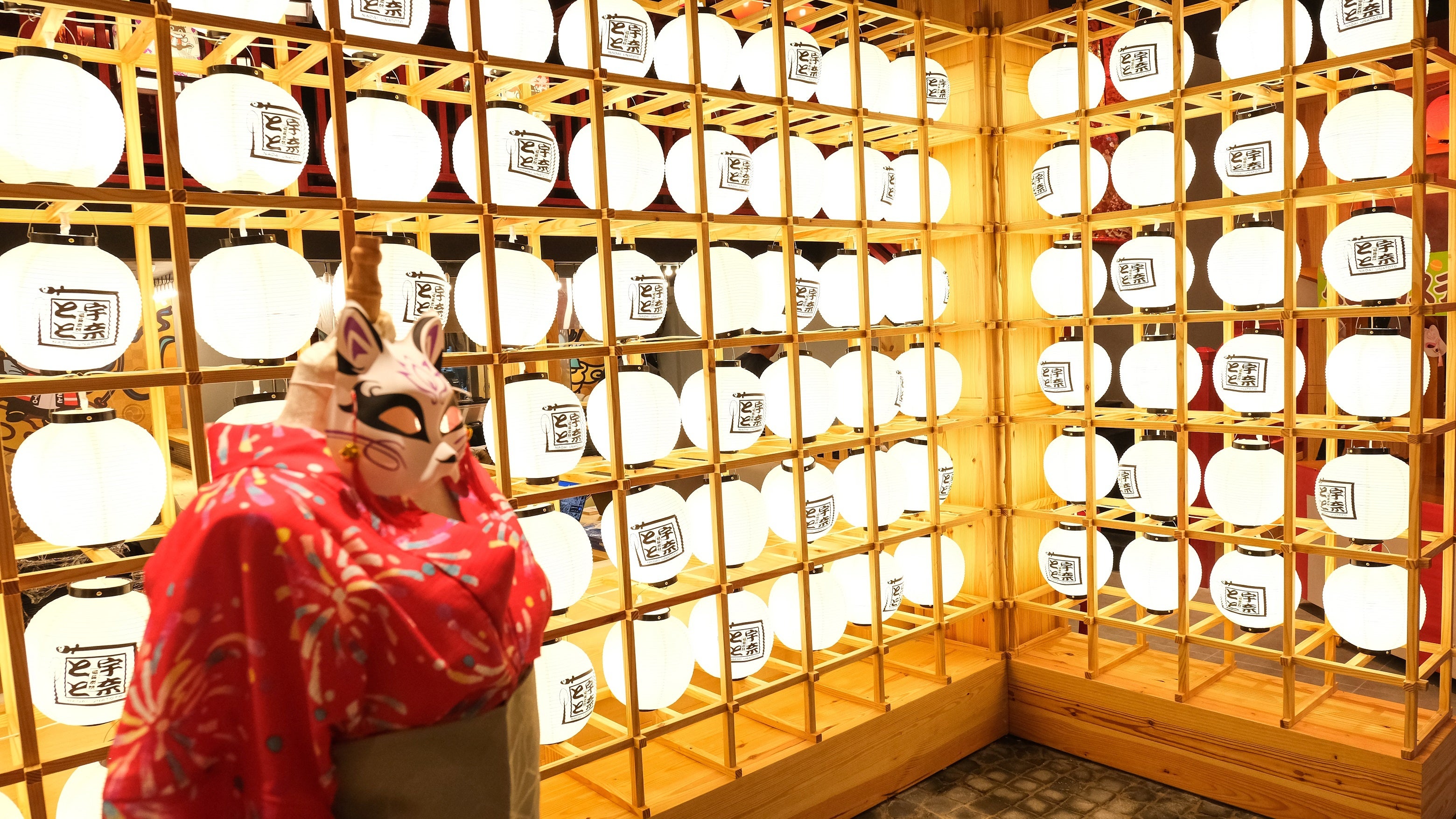 入口の通路は、壁一面に名代 宇奈ととのロゴの入った提灯がずらり!