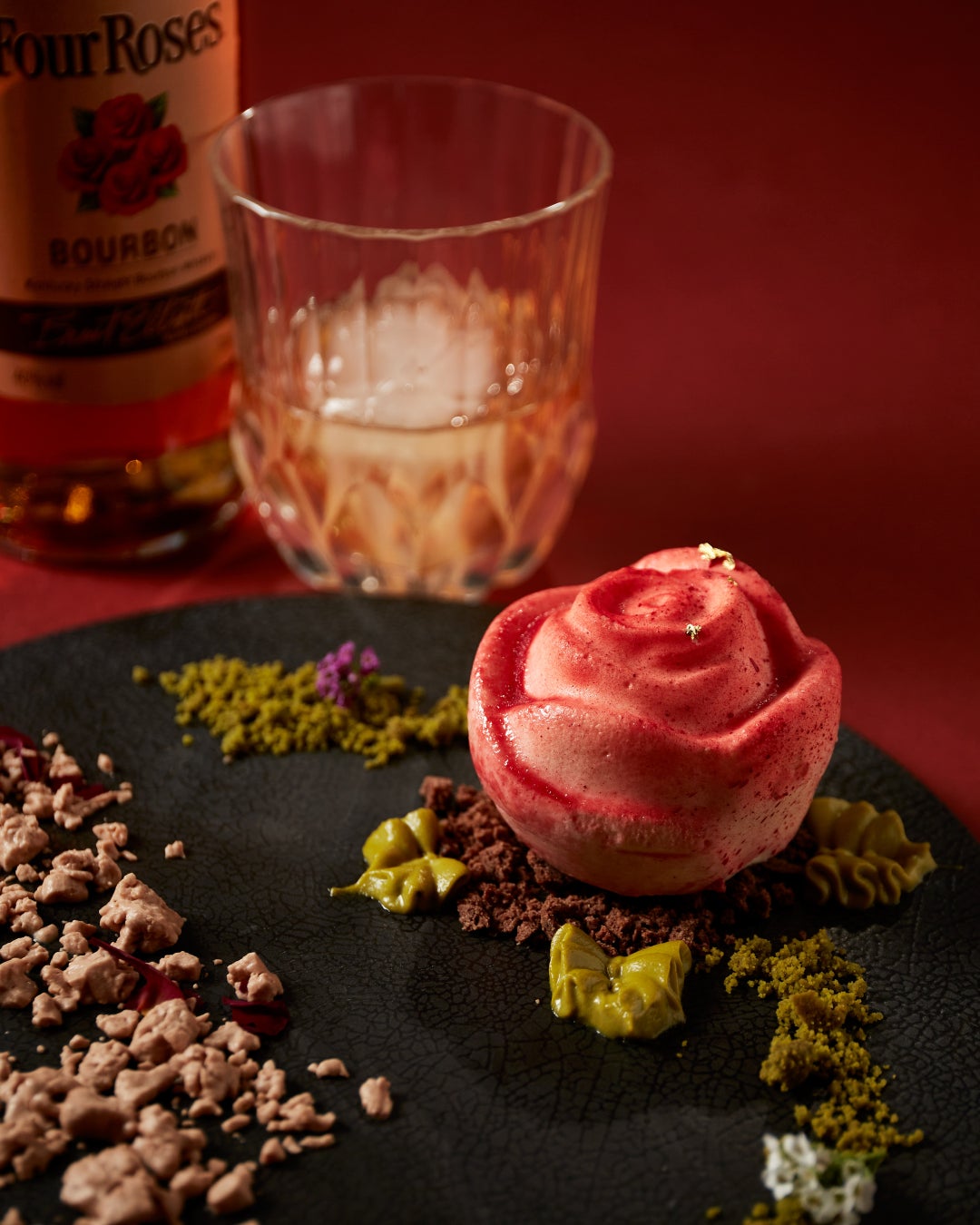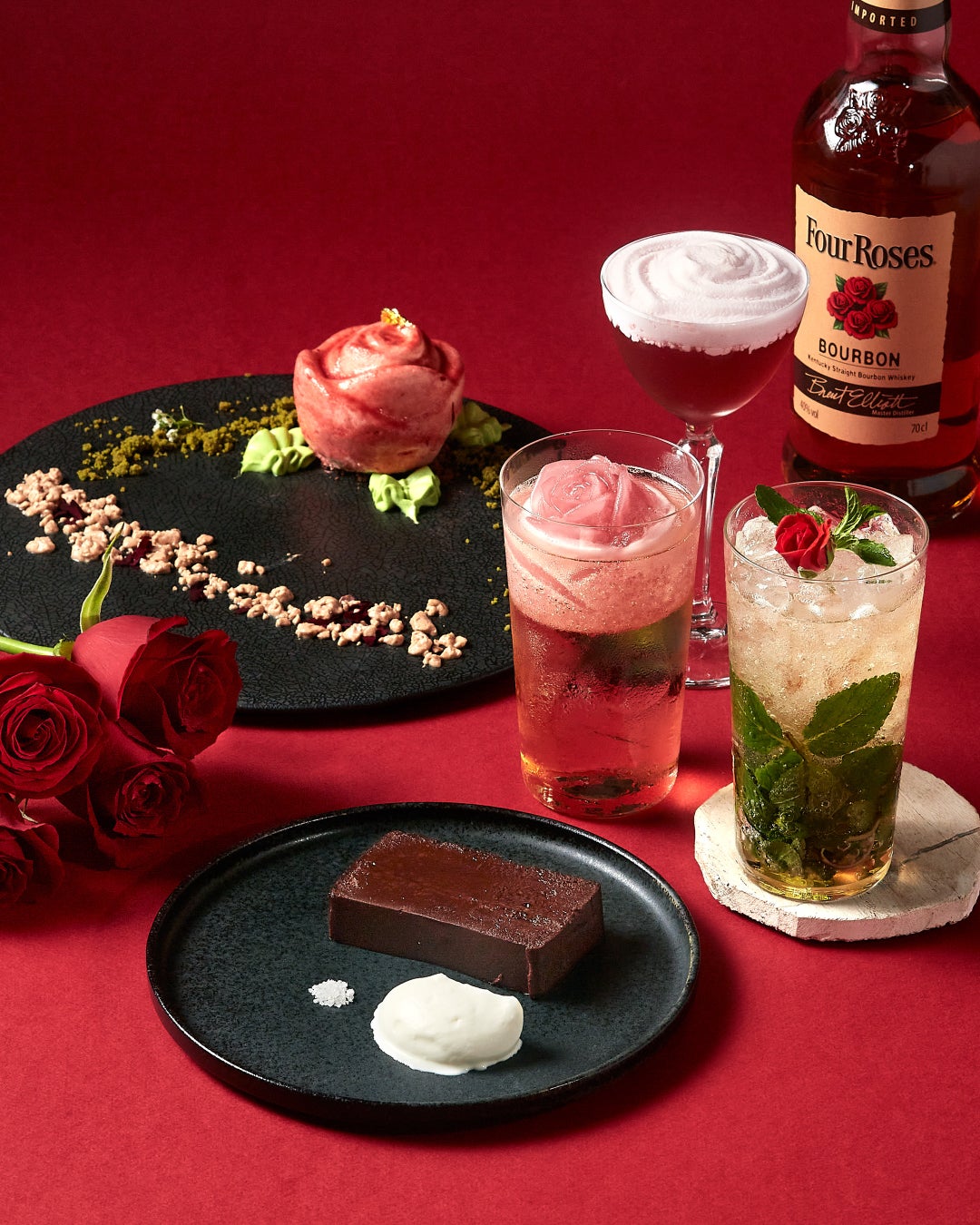 まろやかな味わいと華やかな香りを持つ薔薇のバーボン「フォアローゼズ」とタイアップしたオリジナルデザートとカクテルをご提供。ミヤシタパーク3F「NEW LIGHT」にて4/19(金)より期間限定販売