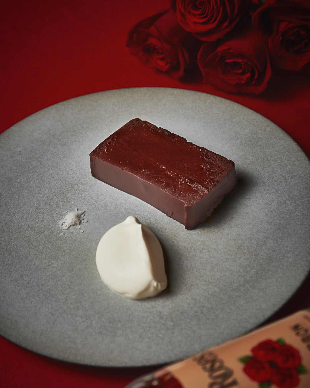 華やかな愛の薔薇をイメージした特別なデザート。抹茶のクランブルとカカオクランブルが、繊細なティラミスのベースを豊かに彩ります。ピスタチオクリームの葉の部分は優雅な香りと繊細な味わいを加え、エディブルフラワーが華やかなアクセントを添えます。さらに液体窒素で凍らせたチョコレートパウダーアイスが、口の中で溶けるような贅沢な味わいを演出します。
