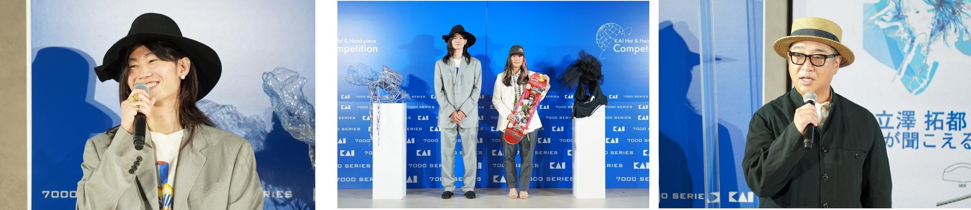 続いて、本コンテストの特別審査員のプロスケートボーダー 四十住さくら選手とスペシャルサポーターのモデル 冨永愛さんにご登壇いただき、「ハットの日」ということで帽子についてお話していただきました。